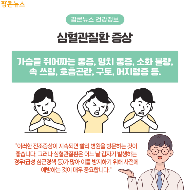 숨가쁨은 단순히 운동 부족 또는 불안감 때문일 수 있으나, 다음과 같은 심혈관 질환의 징후일 수 있습니다: